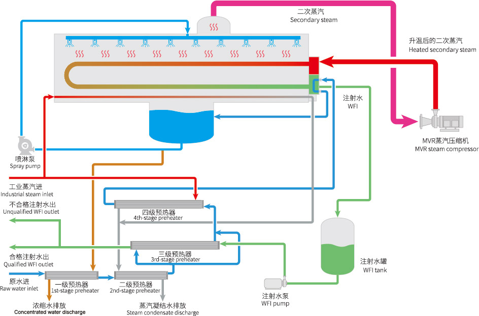 PA视讯官方网站最新研发生产的热压蒸馏水机使用了MVR节能技术,具有产水优质、节能效果显著、安装使用灵活等优点。PA视讯官方网站热压蒸馏水机产量可从1T/h至100T/h[1],既可为客户提供大处理量中心式制水方案,基于其超低的产量范围和撬装模块化设计,也可为客户提供灵活的分布式注射用水生产解决方案。